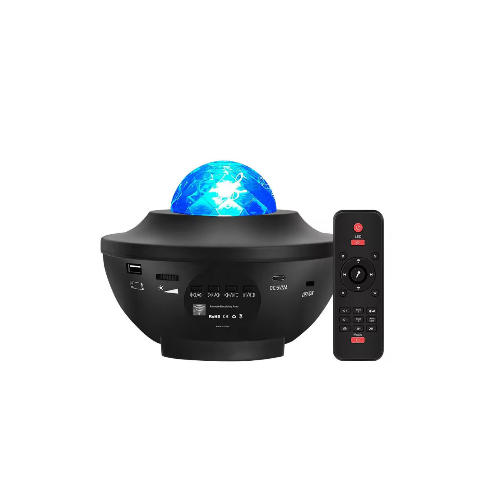 • Fjernbetjening inkluderet – juster lysstyrke, skift mønstre, musik og timer med et enkelt tryk.